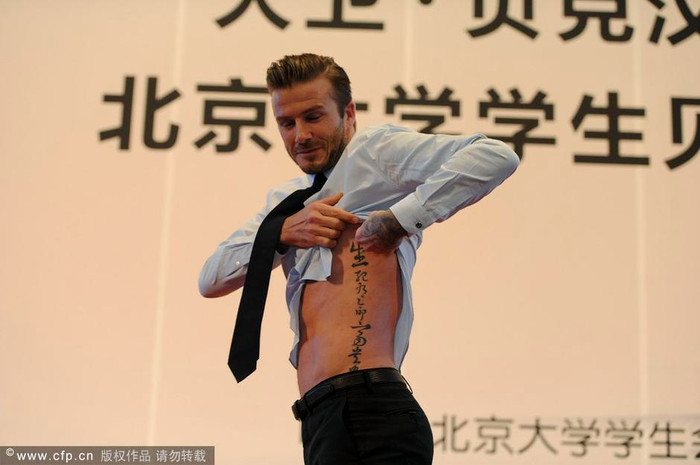 | Trước sự cổ vũ nồng nhiệt của các bạn sinh viên, Becks đã bất ngờ khoe hình xăm độc bằng tiếng Trung |