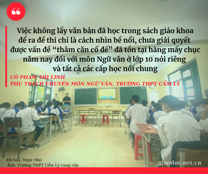 Chia sẻ với phóng viên Tạp chí điện tử Giáo dục Việt Nam, cô Phạm Thị Linh, Tổ phó Tổ Văn – Sử - Giáo dục công dân, phụ trách Chuyên môn Ngữ văn, Trường Trung học phổ thông Cẩm Lý cho biết: “Cũng giống như các trường trung học phổ thông khác khi dạy chương trình mới ở môn Ngữ văn lớp 10, cá nhân tôi ghi nhận những ưu điểm và hạn chế còn bộc lộ trong quá trình triển khai thực tế của trường. Trong đó, giáo viên được tham gia tập huấn, nâng cao chuyên môn nghiệp vụ đáp ứng được nhu cầu của đổi mới chương trình giáo dục phổ thông 2018”.