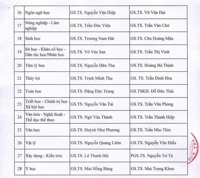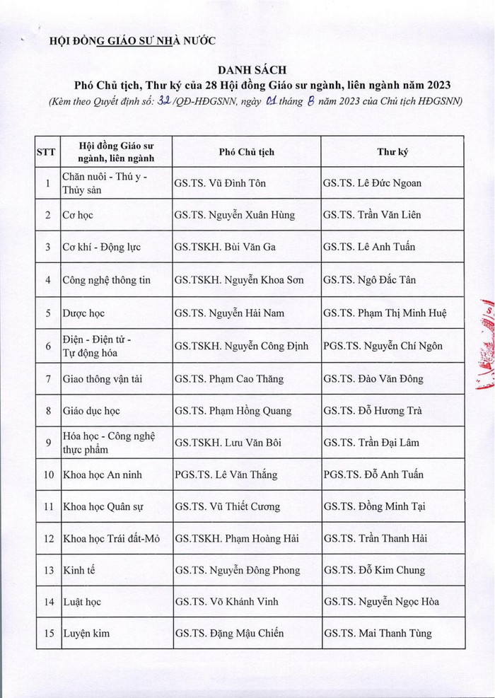Cụ thể, danh sách Phó Chủ tịch, Thư ký của 28 Hội đồng Giáo sư ngành, liên ngành năm 2023 như sau:
