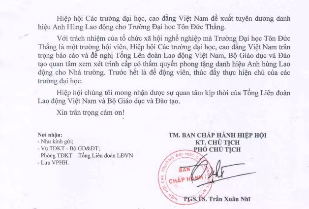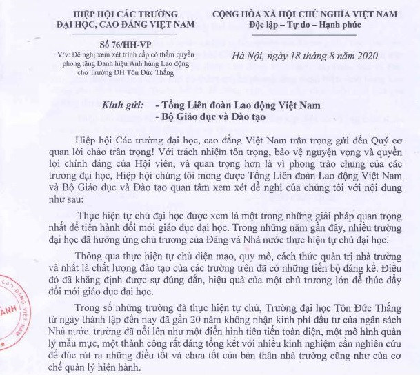 Ngày 18/8, Hiệp hội Các trường đại học, cao đẳng Việt Nam gửi công văn đề nghị xem xét trình cấp có thẩm quyền phong tặng Danh hiệu Anh hùng lao động cho Trường Đại học Tôn Đức Thắng gửi lên Tổng Liên đoàn Lao động Việt Nam và Bộ Giáo dục và Đào tạo.