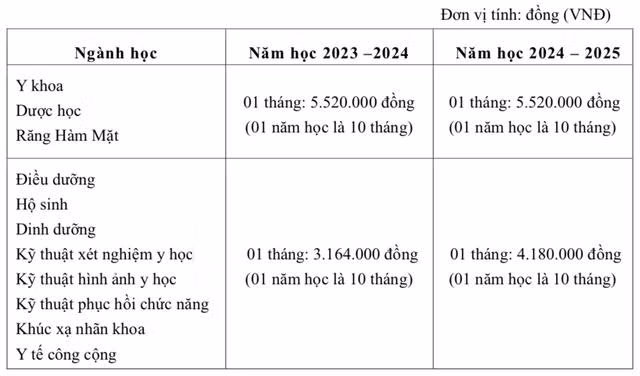 Như vậy, ngành Y khoa có mức học phí cao nhất, với 55 triệu đồng/năm. Trong khi đó, học phí của ngành Dược học là 51 triệu đồng/năm. Các ngành học còn lại bao gồm Điều dưỡng, Răng Hàm Mặt, Kỹ thuật xét nghiệm y học, và Kỹ thuật hình ảnh y học là 27,6 triệu đồng/năm.