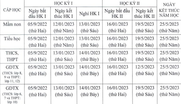 Cũng theo khung kế hoạch này, học kỳ I sẽ kết thúc trước ngày 15/1/2023, hoàn thành kế hoạch giáo dục học kỳ 2 trước ngày 25/5/2023 và kết thúc năm học trước ngày 31/5/2023.