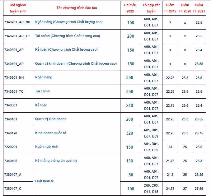 | Chỉ tiêu cụ thể các ngành đào tạo năm 2022 của Học viện Ngân hàng. Nguồn: Website nhà trường |