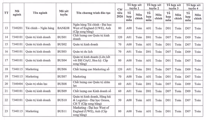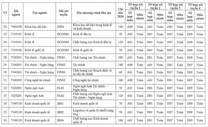 Về chỉ tiêu tuyển sinh, năm 2026, Học viện Ngân hàng tuyển 4690 chỉ tiêu cho 45 ngành/chương trình đào tạo, xét các tổ hợp A00; A01; D01; D07; D09; D14; C00; C03.