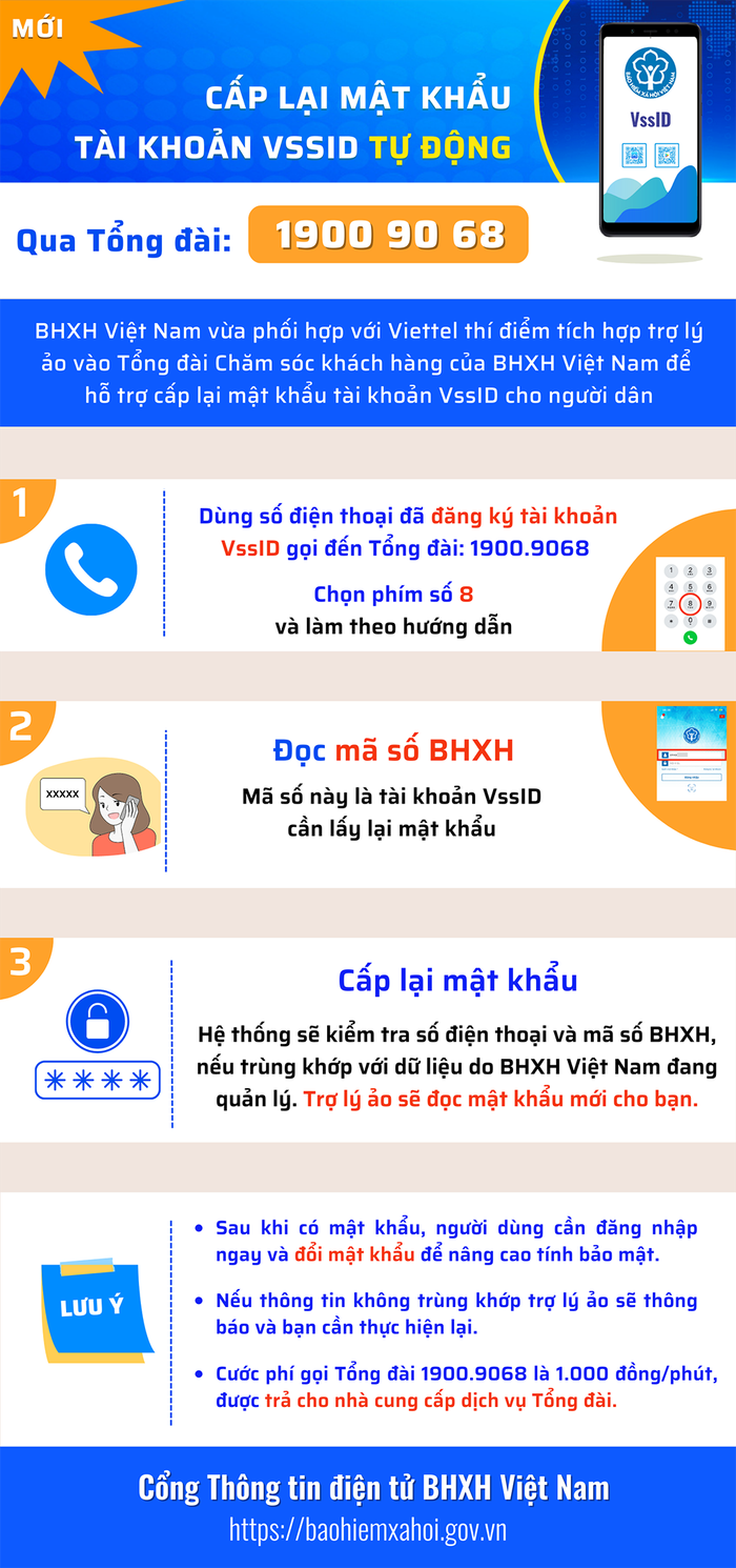 Bước 1: Sử dụng số điện thoại đã đăng ký tài khoản ứng dụng VssID gọi điện đến Tổng đài 1900.9068, nhấn phím số 8 để lựa chọn chức năng cấp lại mật khẩu VssID và làm theo hướng dẫn.