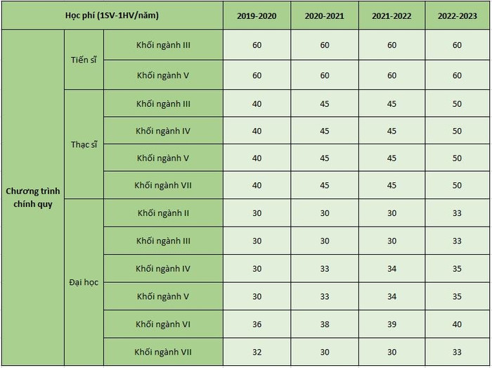 Theo báo cáo công khai tài chính từ năm học 2019-2020 đến năm học 2022-2023, học phí hệ đại học chính quy tăng từ 30-36 triệu đồng lên 33-40 triệu đồng sau 4 năm.