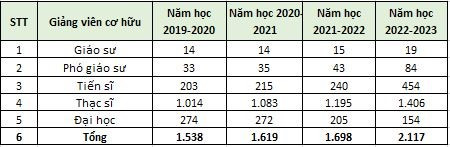 Trong đó, tăng 5 giáo sư (tăng 37,1%); thêm 51 phó giáo sư (tương đương tăng 154,5%); tăng 251 tiến sĩ (tương đương hơn 123,6%).