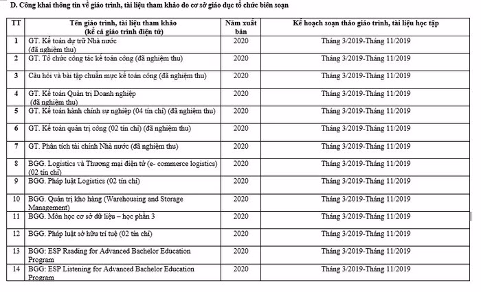 Cụ thể, theo điểm đ, khoản 1 Điều 7: Công khai đối với cơ sở giáo dục đại học, trường cao đẳng sư phạm, trung cấp sư phạm: Giáo trình, tài liệu tham khảo do cơ sở giáo dục tổ chức biên soạn: công khai tên các giáo trình (kể cả giáo trình điện tử), tài liệu tham khảo, năm xuất bản, kế hoạch soạn thảo giáo trình, tài liệu tham khảo của các chuyên ngành.