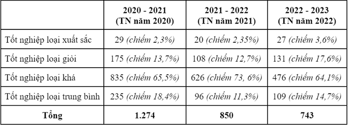 Khảo sát lượng sinh viên tốt nghiệp trong 3 năm gần đây cho thấy số lượng sinh viên tốt nghiệp năm 2022 có xu hướng giảm so với các năm 2020 và 2021. Chi tiết thể hiện trong bảng thống kê sau: