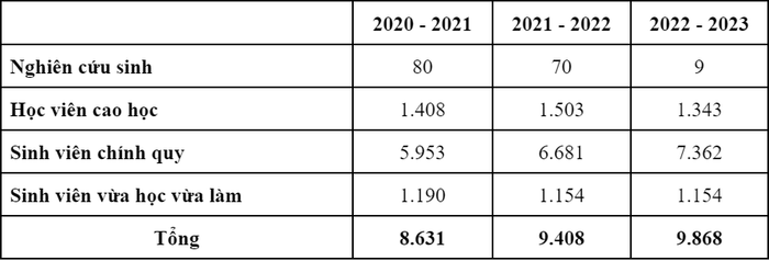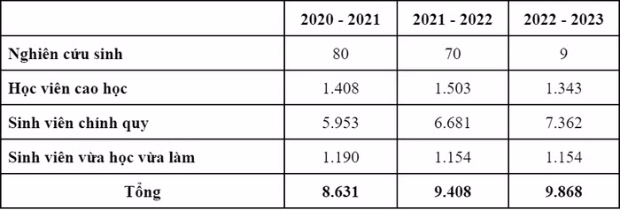 So sánh với năm học 2020-2021, năm học 2021-2022 giảm 10 nghiên cứu sinh, đặc biệt quy mô đào tạo nghiên cứu sinh giảm mạnh trong năm học 2022-2023, giảm tới 71 nghiên cứu sinh (tương đương 88,75%).