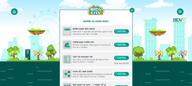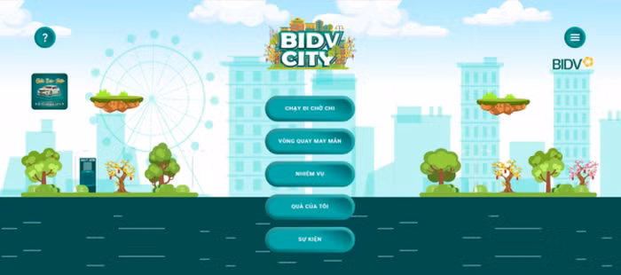 BIDV City là game tương tác tại địa chỉ: https://bidvcity.bidv.com.vn/ dành cho bất cứ ai có đam mê khám phá thử thách để đạt được các giải thưởng hấp dẫn. Người chơi không cần phải là khách hàng của BIDV cũng có thể tham gia chương trình.