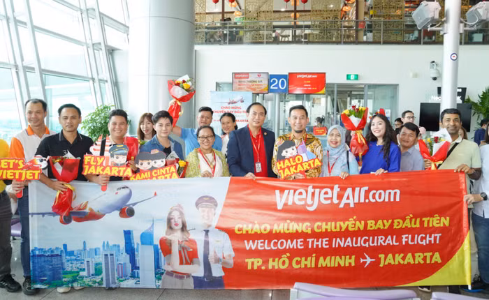 | Vietjet chào mừng các hành khách trên chuyến bay đầu tiên từ Thành phố Hồ Chí Minh đi Jakarta tại sân bay quốc tế Tân Sơn Nhất. |