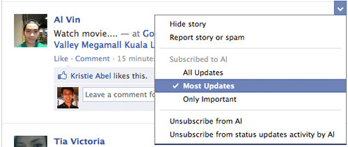 Tại đây, bạn thiết lập chế độ theo dõi: All Updates (Tất cả cập nhật), Most Updates (Hầu hết các cập nhật) hoặc Only Important Updates (Chỉ các cập nhật quan trọng). Ngoài ra, bạn có thể không theo dõi bất kỳ tin tức gì đến từ người bạn này (Unsubscrible from…).