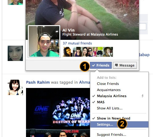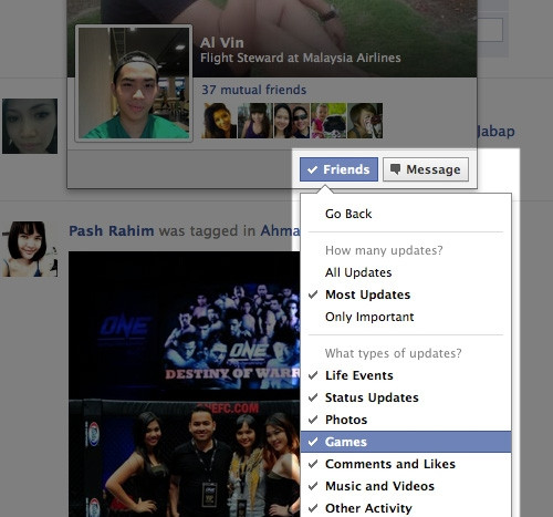 Nếu bạn chỉ muốn hạn chế vài loại cập nhật nhất định của đối phương (như các trò chơi chẳng hạn), hãy truy cập profile-ecard của họ và bấm chọn Settings tại biểu tượng Friends.