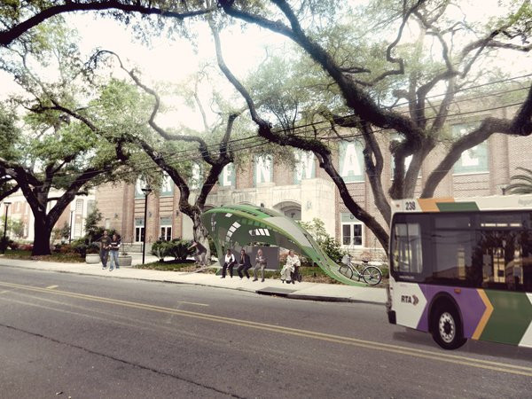 Green Wave Bus Stop là một ý tưởng mới của nhà thiết kế công nghiệp mới nổi Austin Frankel đến từ New Orlean, Mỹ. Trạm xe bus được tạo hình tương tự như làn sóng màu xanh lá cây, màu sắc gắn kết với hệ sinh thái. Điều đặc biệt trong thiết kế này là khả năng chiếu sáng tối đa của các bóng đèn vào ban đêm nhờ sự chuyển hóa năng lượng mặt trời từ các tấm pin mặt trời được gắn bên cạnh.