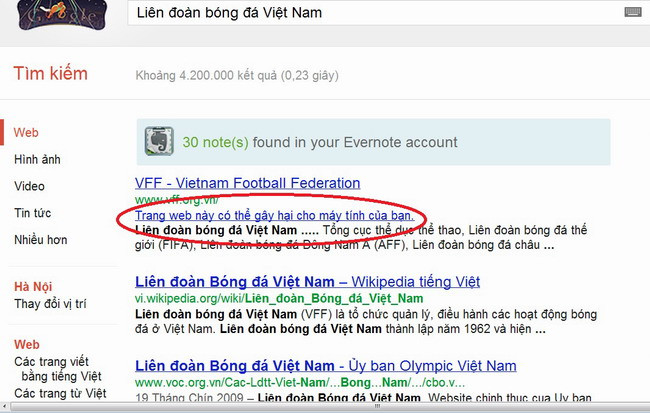 Còn khi sử dụng công cụ tìm kiếm của Google để tìm các website nêu trên, kết quả trả về kèm thêm dòng chữ "Trang web này có thể gây hại cho máy tính của bạn".
