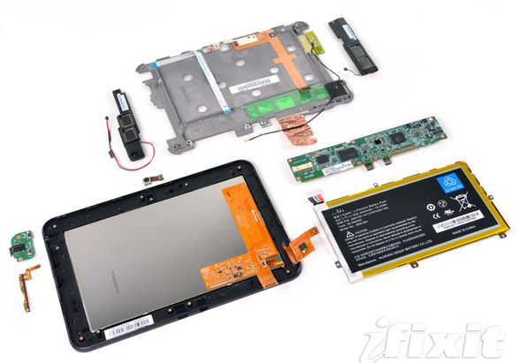 | Thành phần các linh kiện trên bo mạch chủ của Kindle Fire HD 7 inch: Màu đỏ (chíp nhớ 16 GB KLMAG2GE4A eMMC của Samsung), màu da cam (1 GB RAM DDR 2), màu vàng (chip xử lý Texas Instruments TWL6032 Fully Integrated Power Management IC), màu xanh lá cây (chip quản lý giao tiếp không dây của Broadcom, màu xanh lam (chip Wolfson WM8962E Ultra-Low Power), màu hồng (chip kết nối Wi-Fi). |