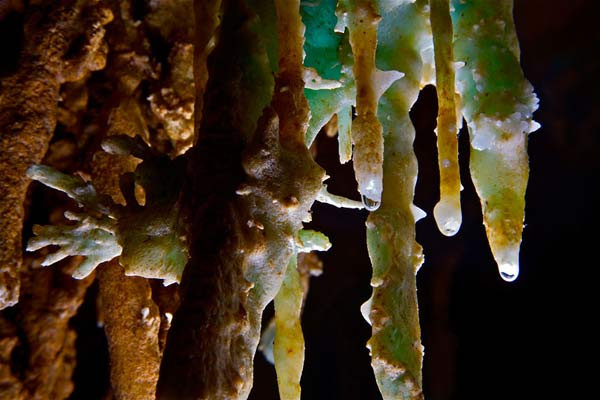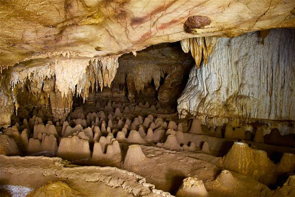 | Khác với những cột thạch nhũ cao, hang động Tham Pha Mon ở Pang Mapha sở hữu những đụn thạch nhũ thấp, phát triển bề ngang, với những đường vạch trắng quyến rũ. |