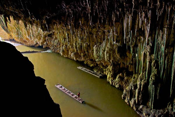 | Để vào được hang động Tham Lod, thay vì đi qua những con đường mòn hiểm trở, du khách chỉ có một cách là đi bè vào bên trong. Càng vào trong, hang động càng rộng rãi, với những thạch nhũ phía trên cao tuyệt đẹp. |