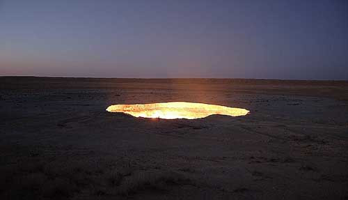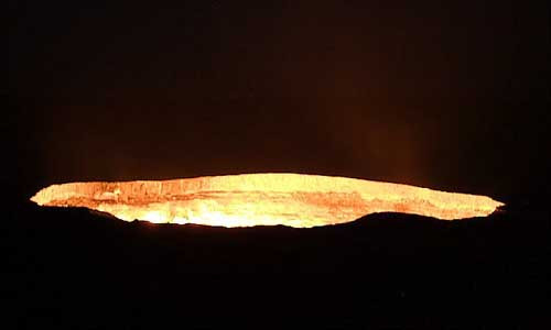 | Lỗ hổng nằm ở Derweze, ở giữa sa mạc Karakum, Turkmenistan. Ngọn lửa dưới lỗ hổng tạo ra một vùng ánh sáng vàng có thể nhìn thấy nó khi ở cách đó hàng nghìn km. |