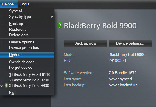 Ngay từ bây giờ, người dùng BlackBerry Bold 9900, Bold 9790 và Curve 9360 có thể kiểm tra và nâng cấp hệ điều hành BlackBerry OS 7.1 bằng cách truy cập vào địa chỉ vn.blackberry.com/update hoặc kết nối thiết bị với máy tính, chạy tiện ích BlackBerry Desktop Software > nhấn Device > Update và làm theo hướng dẫn để nâng cấp hệ điều hành mới.