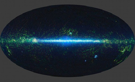 Dải Ngân hà có hình đĩa lồi với phần trung tâm màu xanh, đại diện cho ánh sáng hồng ngoại với bước sóng 3,4 micromet, chủ yếu là đến từ những ngôi sao.