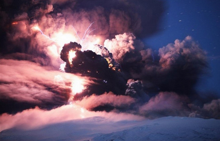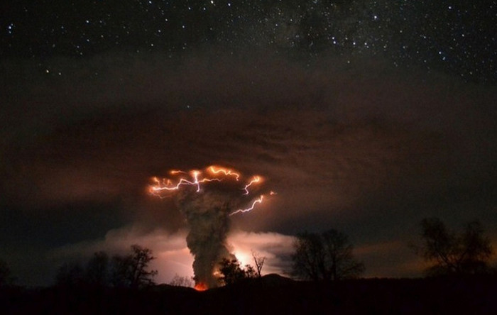 | Những tia sét chằng chịt trên bầu trời đỏ rực. |