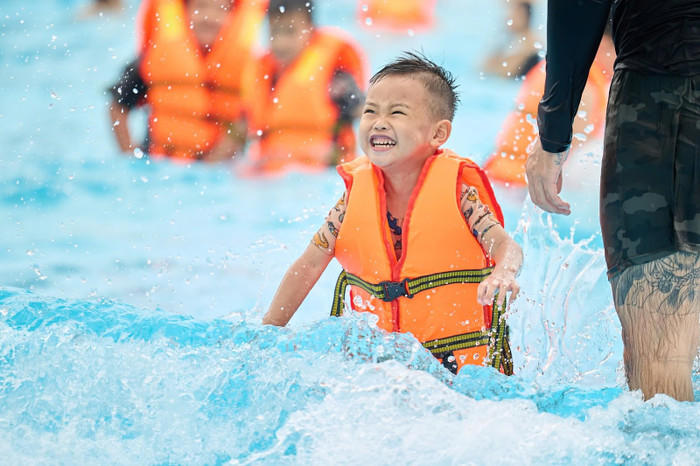 Nhiều trẻ em mặc áo phao để đảm bảo an toàn, hầu hết các bé đều phấn khích, hào hứng với các trò chơi tại công viên.
