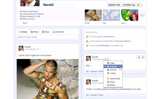 Bước 4. Để quay trở lại trang review, kích vào tên profile ở trên cùng. Cuộn chuột xuống để xem nội dung của Timeline. Mỗi bài đăng tải đều có chứa một icon nhỏ màu xanh bên cạnh tem thời gian của nó. Một chiếc khóa có nghĩa rằng mục tin đó được đánh dấu chỉ cho bạn xem, không ai có khả năng xem nó khi Timeline đi vào hoạt động. Nếu icon này miêu tả 2 cái đầu nhỏ trong hình chân dung có nghĩa là bạn bè trên Facebook xem được mục tin đó; và nếu icon là hình quả cầu nhỏ, nghĩa là tất cả mọi người khi ghé qua trang Facebook của bạn đều xem được. Đối với lĩnh vực này, lựa chọn bảo mật của Timeline không có gì khác biệt so với những lựa chọn áp dụng với tường của Facebook: để thay đổi những gì người khác có thể thấy, kích vào icon và chọn các cài đặt khác nhau.