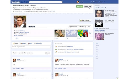 Bước 6. Tiếp đến, xem lại những phần còn lại của Timeline, lặp lại 2 bước trên nếu cần. Khi đã sẵn sàng – hãy nhớ thật cẩn thận bởi Facebook không hiển thị bất kì message xác nhận nào nên bạn không thể quay lại được – quay trở lại trang chủ và kích vào nút Publish Now và Timeline đã chính thức đi vào hoạt động. Nếu muốn khôi phục lại những mục tin đã ẩn trước đó lên Timeline, kích vào nút Activity Log, kích vào dấu “no entry” bên cạnh mục tin liên quan rồi chọn Allowed on Timeline.