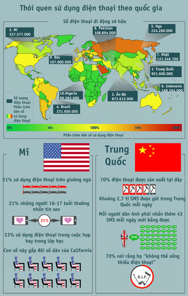 Dưới đây là thói quen sử dụng điện thoại theo Quốc gia.