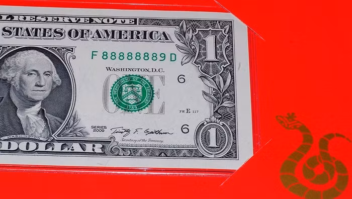 | Tờ 1 USD có số seri cực độc 8888-7777 hứa hẹn mang lại may mắn đặc biệt nếu chủ nhân của nó sinh năm Rắn 1977. |
