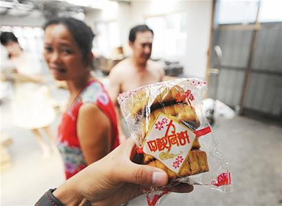 Tại một cơ sở ở Sơn Đông, người sản xuất bánh dùng tay trần vô tư cầm nhân sản xuất bánh Trung thu