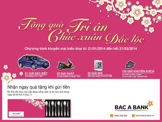 Bắt đầu từ ngày 21/01/2014 đến hết ngày 21/3/2014, Ngân hàng TMCP Bắc Á (BAC A BANK) chính thức triển khai Chương trình Khuyến mại “Tặng quà tri ân, Chúc xuân đắc lộc” cho khách hàng gửi tiết kiệm có kỳ hạn.