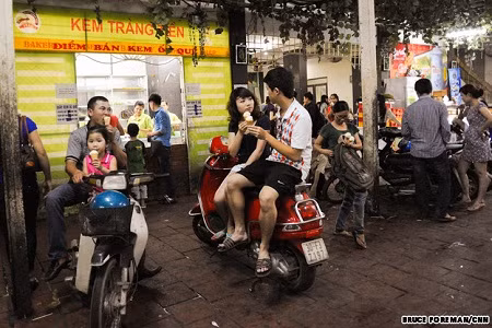 Những khách du lịch trẻ tuổi sẽ nhanh chóng thích nghi với văn hóa xe máy ở Việt Nam. Tại ngôi nhà cổ có mái vòm đua ra – một biểu tượng lâu năm của người Hà Nội – cửa hàng Kem Tràng Tiền, một người cha đưa con tới để tận hưởng niềm hạnh phúc trẻ thơ.