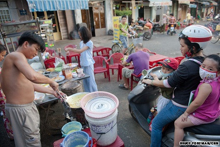 Một quầy bán hàng di động tại quận Tân Bình, thành phố Hồ Chí Minh với bàn ghế nhựa nhẹ tênh giúp người bán bánh tráng này có được địa điểm bán hàng lý tưởng. Người Việt Nam càng lúc càng bận rộn và yêu cầu tốc độ, này là người mẹ đèo con tấp vội vào mua bánh, kia là cậu bé học sinh tranh thủ táp vào ăn món quà vặt.