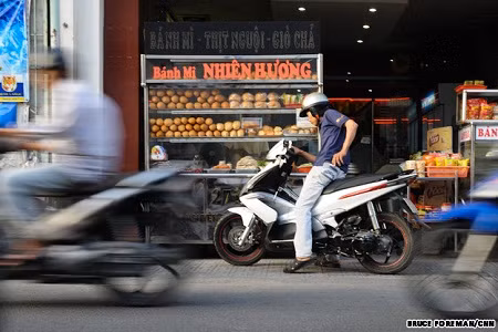 Từ điểm nhìn của một người bán hàng, giao thông vèo vèo thế này không phải là cơ hội tốt để có thể bán được nhiều hàng. Nhưng những món quà vặt nhanh gọn, lấy ngay như bánh mì lại bán đắt hàng trên con phố quanh năm đông đúc Trần Quang Khải.