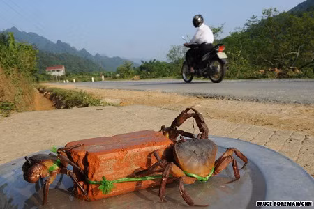 Ở một tỉnh miền núi phía bắc Việt Nam - tỉnh Hà Giang, những người nông dân thu hút khách qua đường bằng các món nông sản tươi sống. Những chú cua này được buộc vào một hòn gạch và đặt trên một cái mâm có để xâm xấp nước – một cách quảng cáo vô cùng độc đáo.