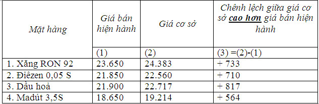 Với nguyên tắc và các thông số tính toán như trên, giá cơ sở các mặt hàng xăng dầu so với giá bán hiện hành như sau: