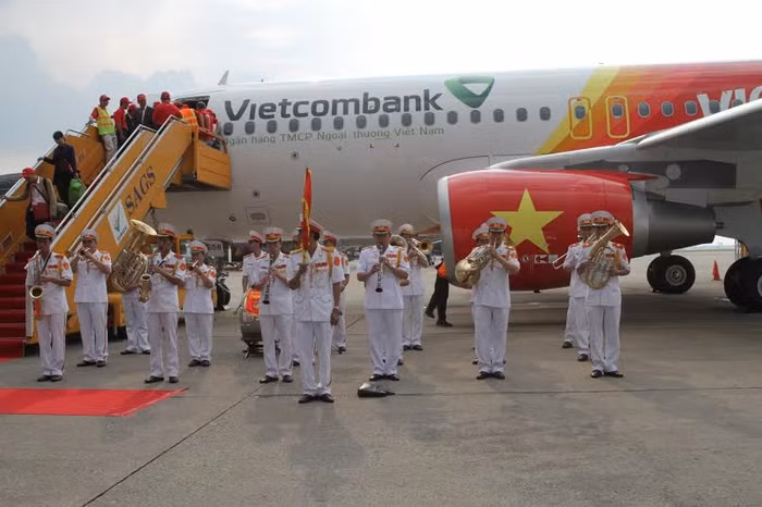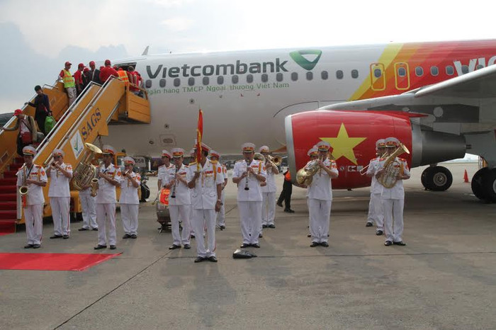 Toàn cảnh đại diện lãnh đạo sân bay Tân Sơn Nhất, các đối tác, công ty thành viên, ban lãnh đạo và nhân viên Vietjet chào đón máy bay A320: