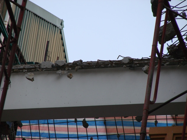 | Nhìn từ dưới chỉ thấy những dàn giáo bắc vút lên trên để phục vụ việc phá dỡ căn nhà |