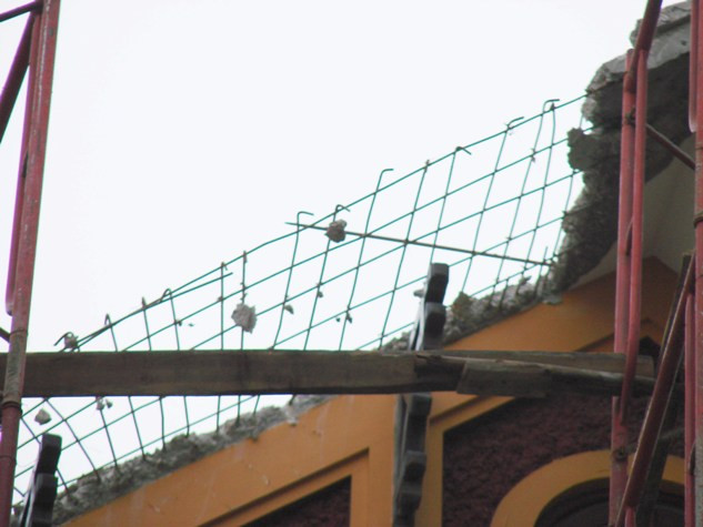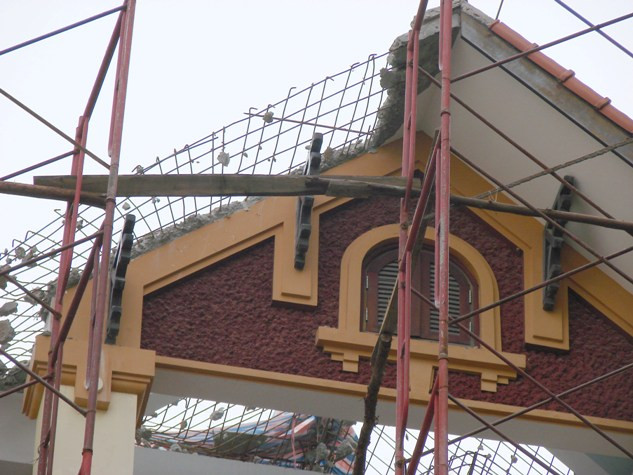 | Từ ngoài chỉ có thể quan sát phần trên ngôi nhà với những dàn giáo và toàn bộ phần mái đang được phá bỏ |