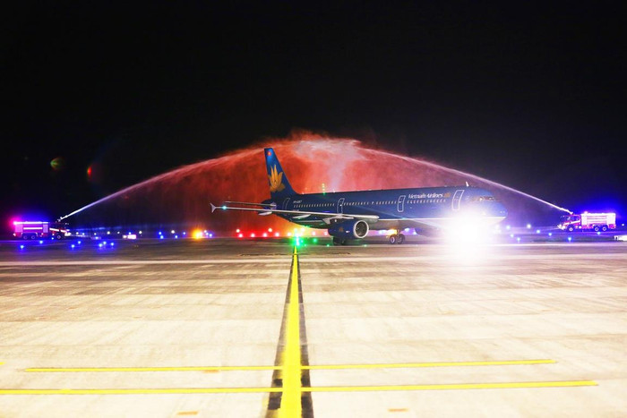 Ông Cao Tường Huy, Phó Chủ tịch Ủy ban Nhân dân tỉnh Quảng Ninh cùng đại diện các sở ban ngành trên địa bàn tỉnh và đại diện sân bay Vân Đồn, đại diện hãng hàng không quốc gia Vietnam Airlines đã tổ chức nghi thức phun vòi rồng chào đón máy bay và tặng hoa hành khách, phi hành đoàn.