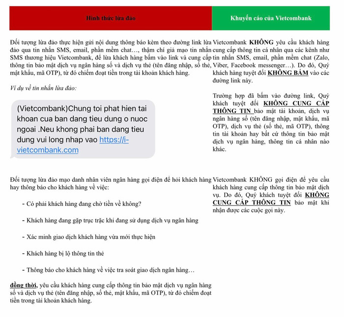 Để đảm bảo an toàn thông tin và tài khoản của quý khách hàng, Vietcombank xin thông báo các hình thức lừa đảo cùng các khuyến cáo như sau: