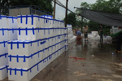 | Các điểm thu mua vải lớn bên đường, nhân công vẫn miệt mài đóng vải vào thùng xốp. Mỗi điểm thu mua như thế này trong ngày mua vào rồi bán ra khoảng 20-30 tấn vải. (Ảnh: VNE) |