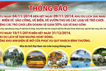 Bên cạnh đó, thông báo cũng cho biết từ hôm nay (4/11) đến ngày 9/11/2014, Khu du lịch sẽ miễn vé vào cổng, vé biển, vé vườn thú và các vé trò chơi. Riêng các trò chơi sẽ giảm giảm 50% giá vé, gồm: Ngũ long cung, Bí mật Kim tự tháp, Ngũ phụng cung, Ngũ lân Đại cung, Long thần đại mê cung…