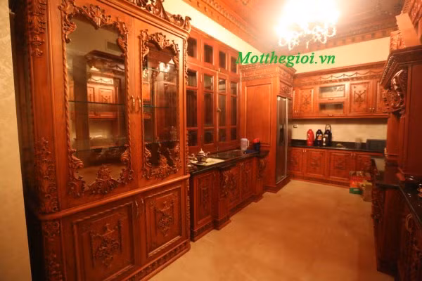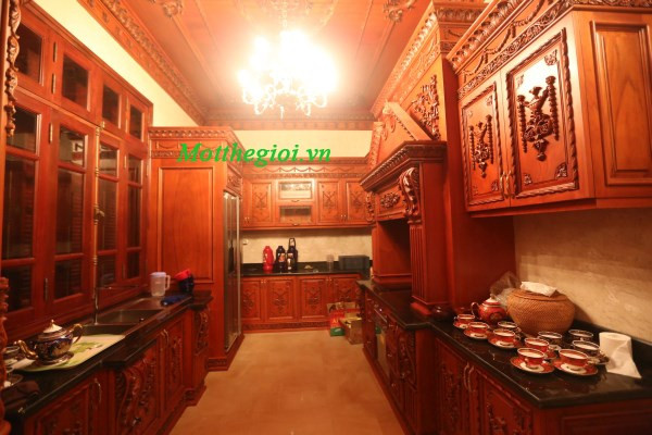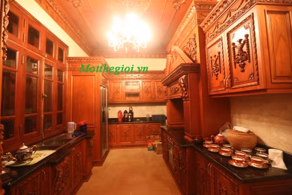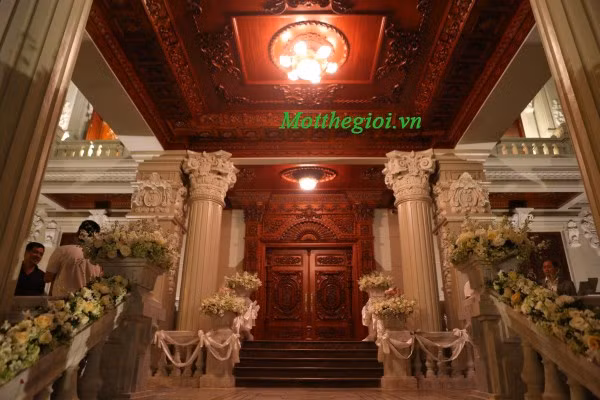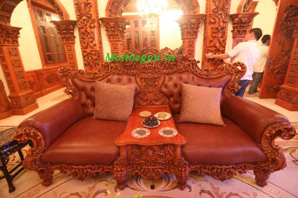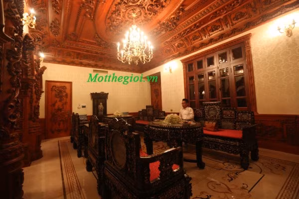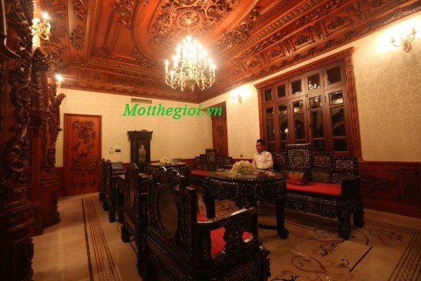 | Toàn bộ bàn ghế, hệ thống trang trí hoa văn, chi tiết cửa trong phòng khách đều được làm bằng loại gỗ đỏ quý hiếm. |