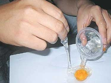 | Làm lòng trứng giả chỉ cần cho muối alginate vào nước khuấy đều cho dung dịch trắng có độ dính như lòng trắng. Sau đó lấy lòng trắng được tạo ra cho thêm màu thực phẩm sẽ có lòng đỏ. |