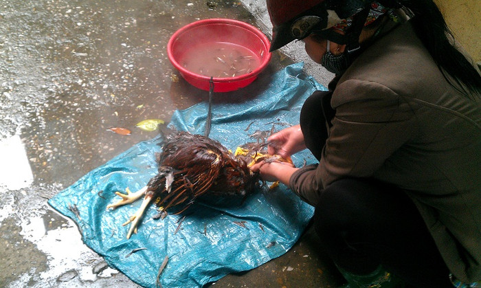 | Chú gà đã được cắt tiết xong. |