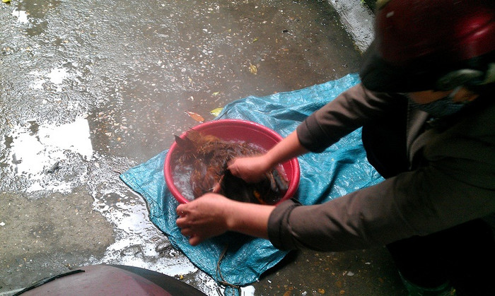 | Thỏa thuận giá cả xong xuôi, người phụ này nhanh tay cắt tiết gà. |